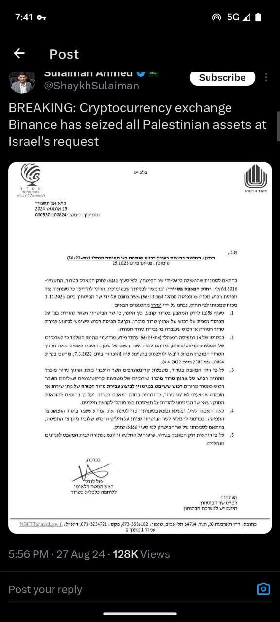 Ray Youssef, the CEO of Noones and co-founder of Paxful, claims that Binance has frozen the funds of all Palestinian users following an order from the Israel Defense Forces (IDF). According to a document purportedly from Israeli authorities, the seizures are justified under the Law on Combating Terrorism, which empowers the Israeli Minister of Defense to temporarily seize the assets of declared terrorist organizations, including cryptocurrencies.