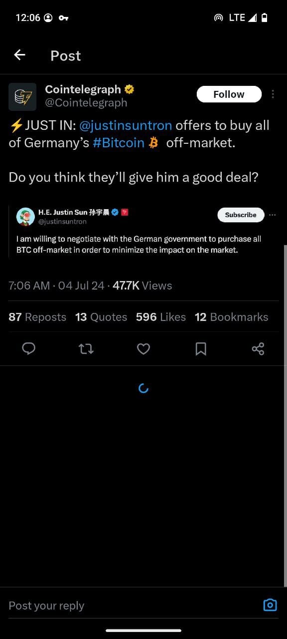 In response to Germany’s sell-off, Justin Sun, founder of TRON, has publicly offered to buy all of Germany’s Bitcoin off-market. Sun’s proposal aims to minimize the impact on the market, which has already seen significant turbulence due to the sell-off.