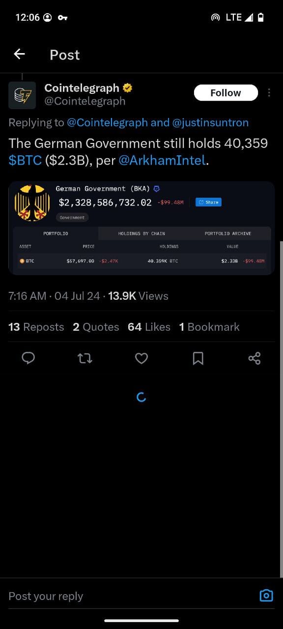 - Volume and Value: Germany still holds over 40k BTC, valued at approximately $2.3 billion. Sun’s acquisition would be a substantial investment, underlining his confidence in Bitcoin’s long-term value.