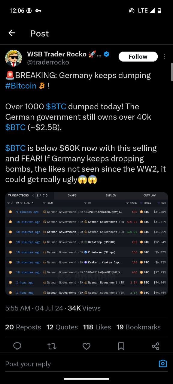 - Price Drop: The large-scale selling has contributed to a significant drop in Bitcoin prices, falling below $60,000, as noted by WSB Trader Rocko.